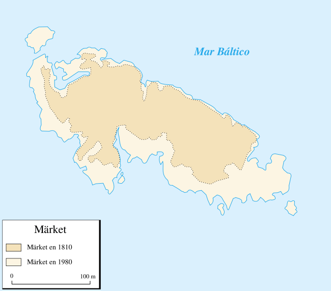 El caso de Märket es aún más extraño. Märket es un pequeño islote de poco más de tres hectáreas, completamente deshabitado. En la isla únicamente hay un faro, construido en 1885, sobre una de las esquinas. El resto de la isla son pedruscos afilados, como mucho a dos metros sobre el nivel del mar. Lo extraño de la isla no es sólo su frontera, como ya veremos, sino que hasta el siglo XVI, de hecho, la isla no existía. Fue el mismo rebote isostático que unió a Kataja e Inakari la hizo emerger justo donde, tres siglos más tarde, se trazaría la frontera entre Rusia y Suecia. La isla estuvo dividida, pues, desde un principio.