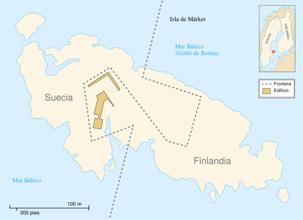 Extensión de Märket en 1810 y 1980 (click para ampliar)Pero la división no fue siempre de la misma manera. Las revisiones periódicas de las que hablábamos al principio también afectan a la isla de Märket, porque, debido al mencionado rebote isostático, la isla no deja de crecer y ascender sobre el nivel del mar, unos cinco milímetros anuales. El efecto se puede comprobar haciendo click en la imagen de la derecha. Por esa razón, cada veinticinco años, la frontera es revisada para que el 50% del territorio siga perteneciendo a cada país. Originariamente la frontera cortaba la isla por la mitad desde el tratado de 1809, en una línea recta de unos cien metros de largo. En 1885, como hemos visto, se construyó un faro, operado por Finlandia, sobre la parte finesa de la isla. O sobre lo que se pensaba que era la parte finesa. En 1981, en una de esas revisiones periódicas de la frontera, los agrimensores descubrieron que el faro estaba íntegramente construido sobre suelo sueco. Así que se tenía que proceder a la modificación de la frontera suecofinesa para que el faro estuviera de nuevo en territorio finés, algo que sólo se podía realizar mediante un intercambio de territorios. Las fronteras marítimas eran intocables, porque podían afectar a las áreas de pesca de cada país, así que se llegó a un acuerdo según el cual el intercambio de territorios se haría dentro de la propia isla. Y lo que quedó fue una rarísima frontera, de casi medio kilómetro de largo en una isla que sólo tiene cien metros de ancho.