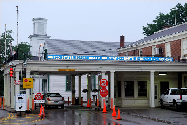 Aduana entre Stanstead y Derby Line, vista desde Canadá. Nótense las señales en francés. Para facilitarles la vida a los vecinos, normalmente no hace falta bajarse del coche para cruzarla.