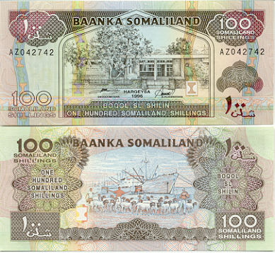 Anverso y reverso de un billete de cien chelines. El cambio aproximado es de 6.400 chelines por dólar. Los dólares son aceptados en cualquier parte del país, pero más vale llevar billetes pequeños.