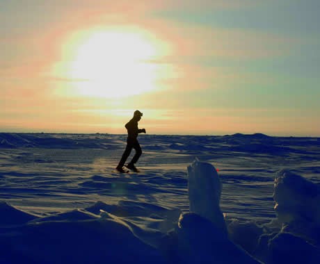 Un corredor bajo el sol de medianoche en el Polo Norte.