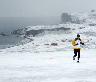 Sobre estas líneas, dos corredores en la soledad antártica. Debajo, el corredor de Singapur William Tan, que en diciembre de 2007 completó los 42 kilómetros y 195 metros sobre el hielo en 9 horas y 48 minutos.