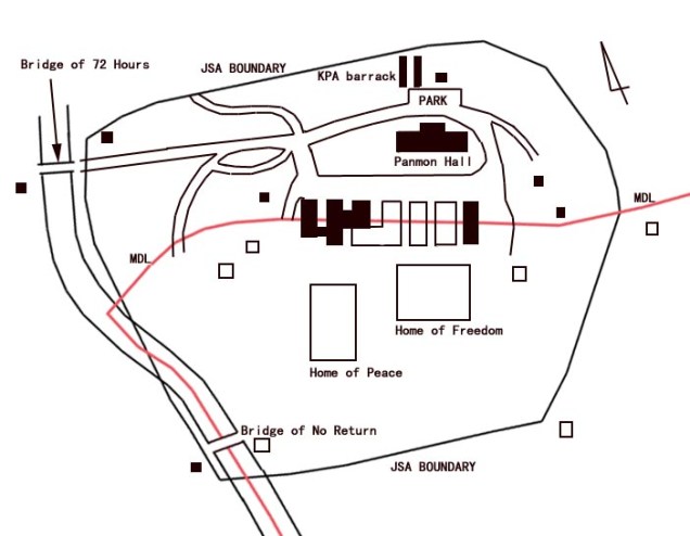 La JSA fue creada mediante el alto el fuego de 1953 como una zona neutral donde la Comisión Militar del Armisticio (MAC, por sus siglas en inglés), compuesta por representantes de ambos contendientes (Corea del Norte y Estados Unidos) pudieran reunirse. Partida en dos por la frontera de facto entre ambas Coreas, originariamente el movimiento era libre para los soldados y representantes de ambos bandos por toda el área. Pero varios incidentes terminaron con la libertad para moverse por el pequeño enclave, de apenas 800 metros de diámetro.