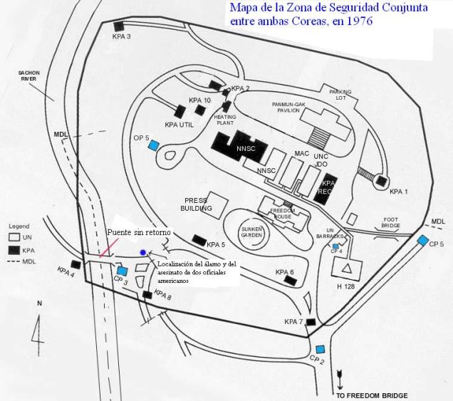 Mapa de la JSA en 1976 (click para ampliar). Al sudoeste de la zona está el Puente sin Retorno. La garita marcada en azul como CP3 era un puesto de la ONU conocido como «El más solitario del mundo», dado que, al estar todos sus accesos rodeados de puestos norcoreanos (marcados en negro con las siglas KP), los intentos de secuestro por parte de los soldados comunistas eran habituales. Todos esos puestos fueron desmantelados tras la muerte de los dos oficiales americanos.