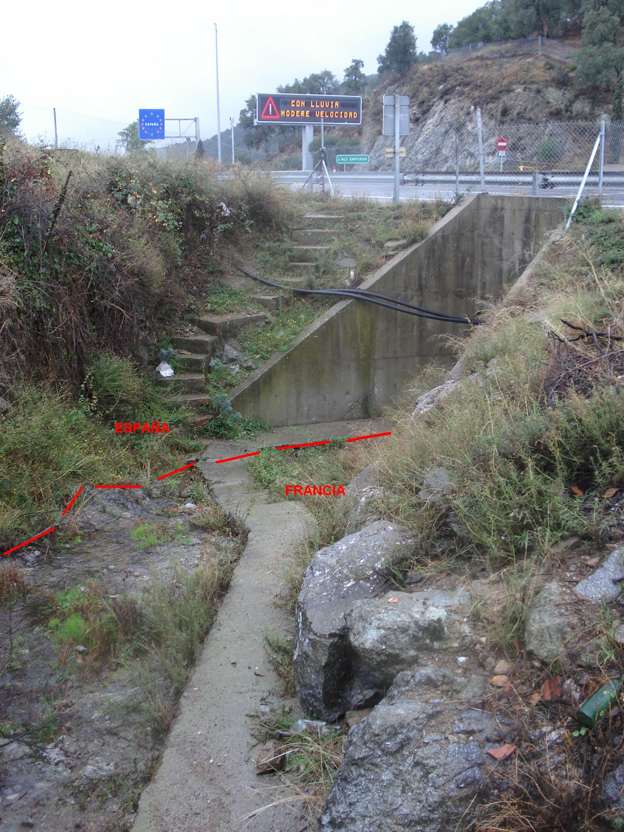 Sobre estas líneas, la boca Este del pequeño túnel bajo la autopista (otra foto se puede ver aquí). La orilla oriental del arroyo marca la frontera entre España y Francia. Debajo, línea fronteriza sobre la autopista. Obsérvese el cartel (español) de kilómetro cero. Ochocientos metros al norte se encuentra la aduana francesa. Al fondo se distinguen las casas de Le Perthus.