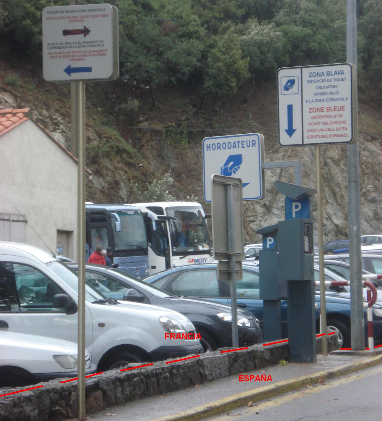Arriba, arquímetros español (delante) y francés (detrás). En los carteles, en francés y catalán, se indica la obligatoriedad de pagar por el aparcamiento, y que los tíquets franceses no son válidos en la zona española, y viceversa. Debajo, el árbol internacional (foto de Chaland)