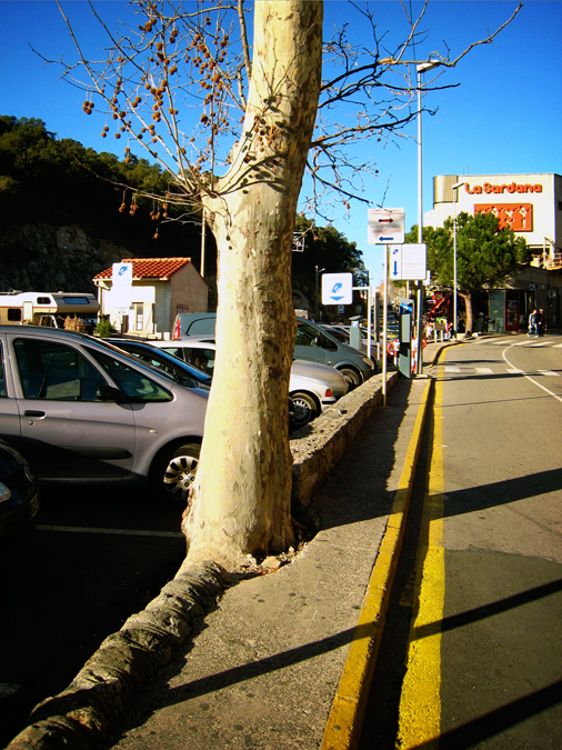Aparcar el coche en Francia y bajar de él en España. Ese podría ser el título de esta entrada, y es perfectamente posible hacerlo si uno viaja al pequeño pueblo fronterizo de Le Perthus (El Pertús en catalán y castellano), que comparte la calle principal con el pueblo de Els Limits (Los Límites, en castellano), oficialmente un barrio del pueblo gerundense de La Junquera, a unos 180 kilómetros de Barcelona. La división de ambos pueblos es tal que la calle mayor de El Pertús se encuentra partida en dos. Los edificios situados en el lado occidental de la calle se encuentran en la Avenue de France, mientras que los del lado oriental tienen como dirección postal la Avinguda de Catalunya. En una acera se encuentran bancos españoles y en la de enfrente entidades francesas. Hay un jardín dividido entre los dos países, un árbol binacional y un supermercado llamado, muy propiamente, La Frontera. Si no me pillara tan lejos iría a hacer la compra allí cada semana.