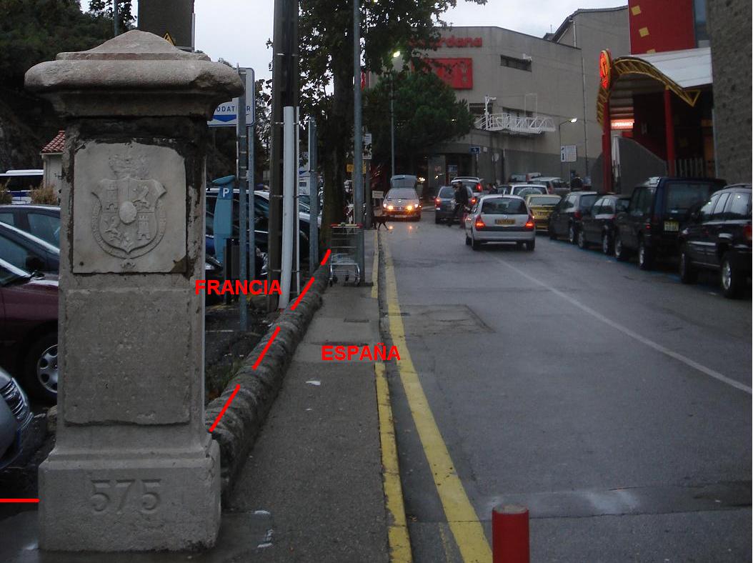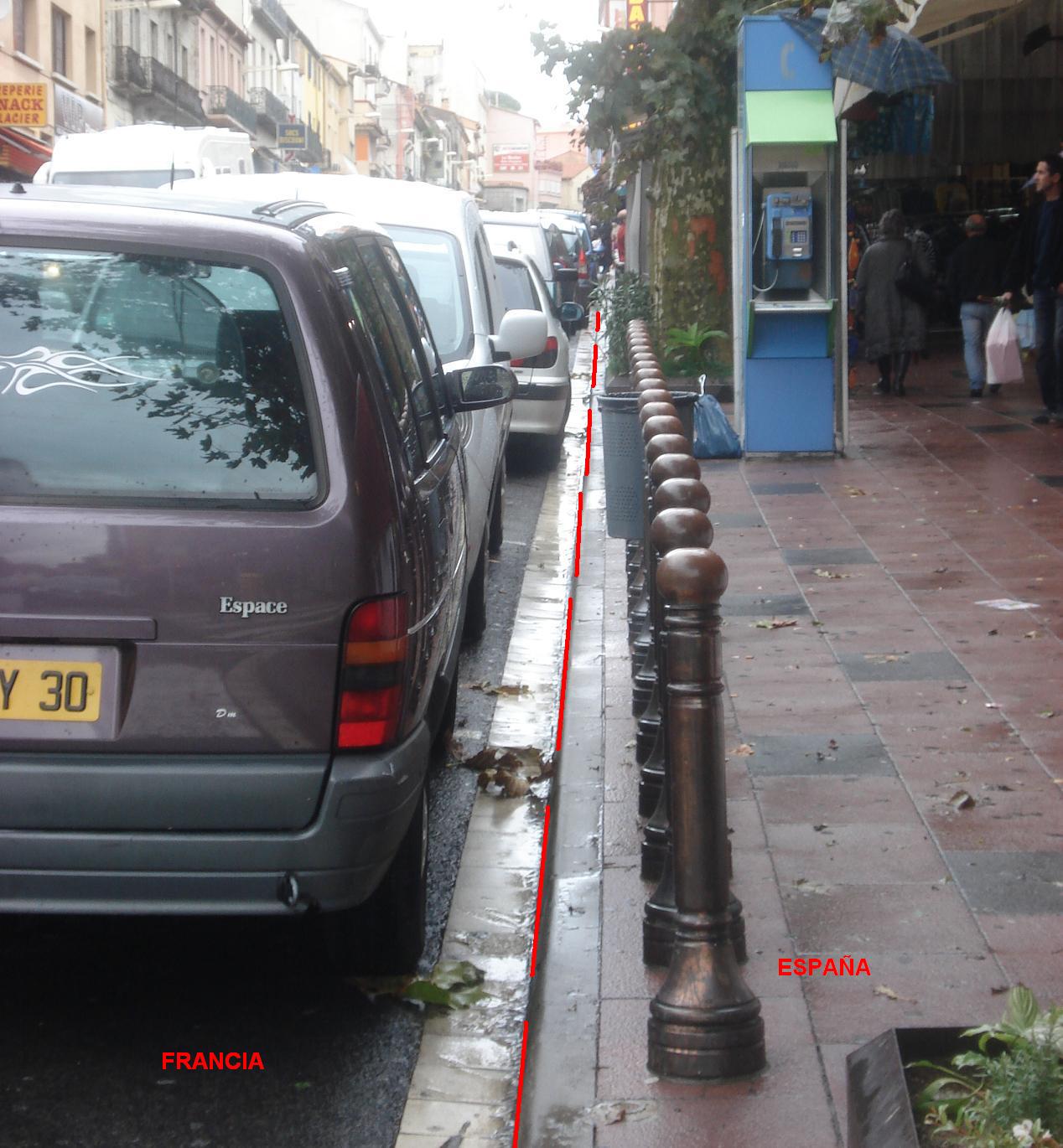 Arriba, la calle principal de Le Perthus y Los Límites. Los coches están aparcados en Francia, los bolardos y la cabina de teléfonos en España. La frontera la marca el bordillo de la acera. Debajo, el hito fronterizo nº 576, en la esquina de la calle principal con la calle del Correc de la Comtessa. En el lado que se ve en la foto está escrito «Galia» en la piedra gris. Al otro lado se lee (malamente) «Hispania».