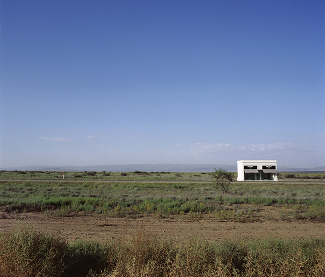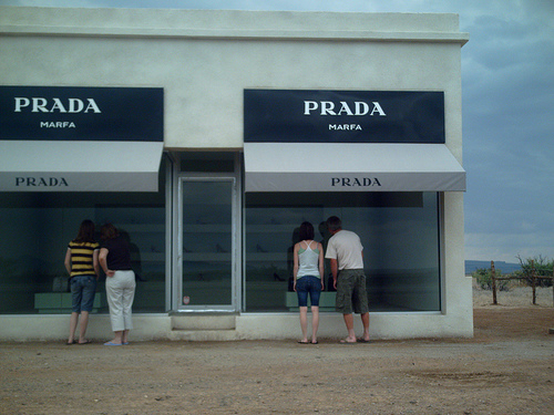 Una tienda de la lujosa marca Prada, de la que viste el diablo, en mitad del desierto. En el escaparate se pueden ver auténticos modelos de bolsos y zapatos de Prada, tanto de día como de noche, puesto que la tienda tiene iluminación propia. La exclusiva boutique no abre nunca, y no cambia jamás su escaparate. Nunca se ha vendido un solo bolso en ella. Simplemente, está allí, a un par de kilómetros del pueblo, solitaria y aislad, como si uno de los muchos tornados que atacan Texas la hubiera arrancado de su ubicación original para depositarla en mitad de la nada.