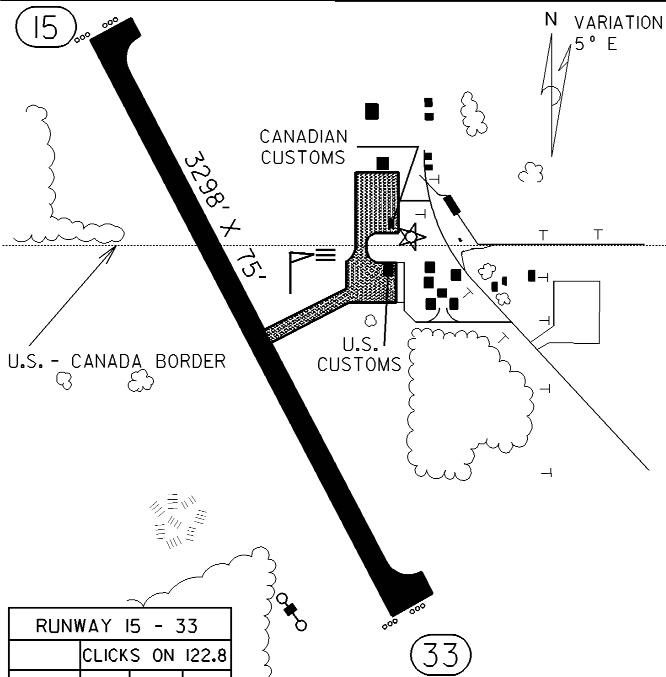 A unos mil kilómetros al este se encuentra el Aeródromo de Coronach/Scobey, situado a quince kilómetros de la primera localidad y a veintiuno de la segunda, entre la provincia canadiense de Saskatchewan y el estado norteamericano de Montana. El aeropuerto es propiedad de ambos gobiernos federales. La pista de césped discurre de este a oeste exactamente sobre el paralelo 49, que marca la mayor parte de la frontera entre EE.UU. y Canadá. Sólo admite, como es lógico, vuelos de aviación general, con un preaviso de dos horas para que los aduaneros tengan tiempo de ponerse en la garita. El aeródromo sólo opera en los horarios en los que la aduana está operativa (sí, algunos pasos fronterizos cierran fuera de horario de oficina, imagínense el plan, «No, íbamos a pasar la tarde en Canadá pero está cerrada»). De todas maneras, no es que la pista se use demasiado; entre julio de 2005 y el mismo mes de 2006 tan sólo se realizaron 10 operaciones de despegue o aterrizaje.