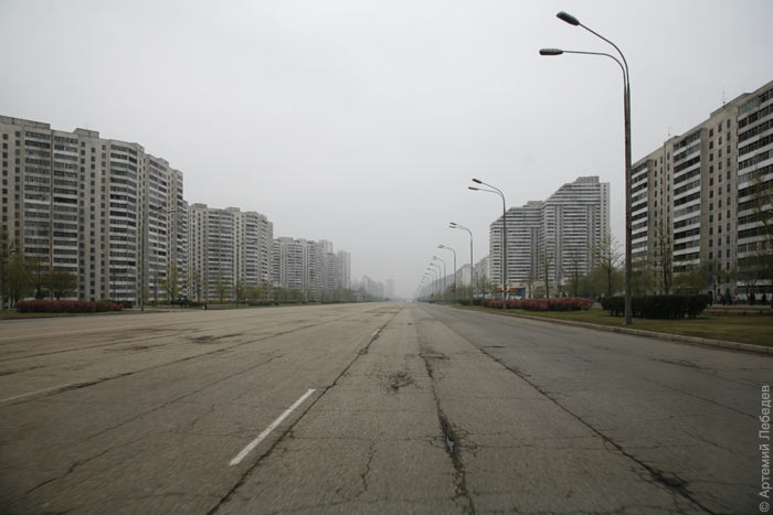 Sobre estas líneas, una futurista área de servicio abandonada en la llamada «Autopista de la Unificación», entre Pyonyang y la frontera surcoreana (© Marc in North Korea). Debajo, vista de una calle de Pyonyang. ¿Hay alguien ahí? (© Artemy Lebedeb)