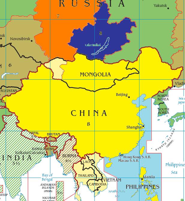 Zonas horarias en China y alrededores. La hora «solar» GMT+8 está representada por la franja azul. La parte occidental de China está en GMT+5.