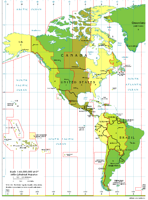 Cuando en Londres sean las cinco de la mañana, toda la costa este de EEUU y Canadá entrará en 2010, junto con lo que quedaba de Sudamérica y las Antillas Mayores. En los EE.UU. continentales hay cuatro zonas horarias, cuyas fronteras ni siquiera coinciden con las de los Estados. Nueva York, Chicago, Denver y Los Ángeles celebrarán el 2010 con una hora de diferencia entre cada uno. Hay pueblos contiguos que celebran la entrada en el nuevo año con una hora de diferencia. Algo así como Rihonor y Rio de Onor, pero en el mismo país. En Canadá y México sucede algo parecido. Junto con Chicago y la zona central del país, toda Centroamérica se sumará al nuevo año, al igual que la mayor parte de México. Alaska lo hará una hora después que Los Ángeles, y Hawai sesenta minutos después que el Estado de Sarah Palin.
