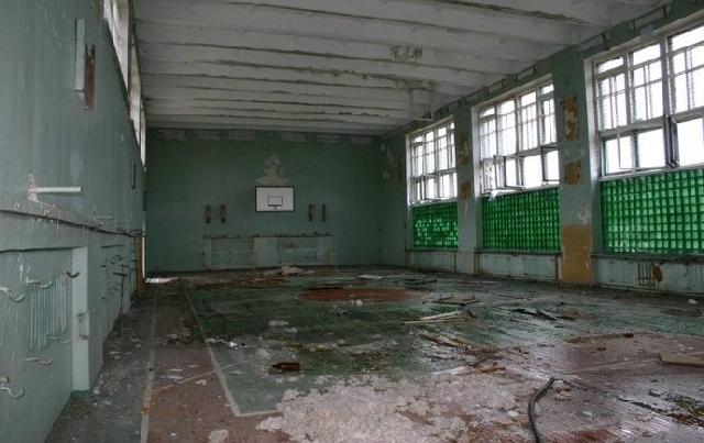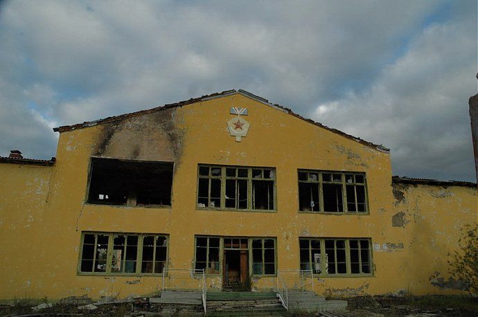 Sobre estas líneas, una cancha de baloncesto abandonada en Promyshlennyi; debajo imágenes desde la casa de la cultura tras ser bombardeada por el ejército ruski. La primera foto (y las dos anteriores) son de English Russia; las dos de debajo son de Halmer-u.info, una página dedicada al pueblo por antiguos residentes. En ella se pueden encontrar imágenes del bombardeo.
