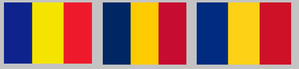 De izquierda a derecha, banderas de Andorra, Chad y Rumanía. La de Andorra es ligeramente diferente a las otras dos; las tres bandas verticales no son idénticas sino que guardan una proporción de 8:9:8.