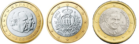 De izquieda a derecha, euros monegascos, sanmarinienses y vaticanos.