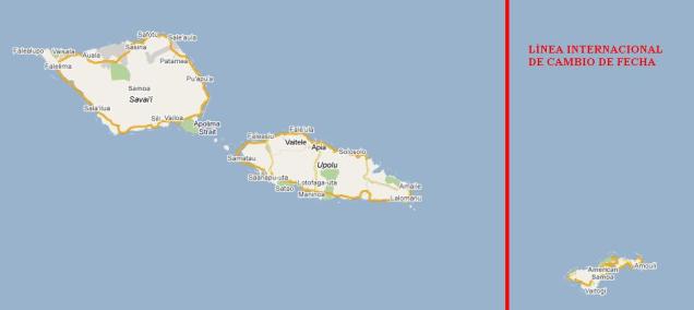 Samoa junto a la línea internacional de cambio de fecha. A partir de la medianoche del 30 de diciembre (que será 31 de diciembre) la línea pasará al este del país, en vez del al oeste.