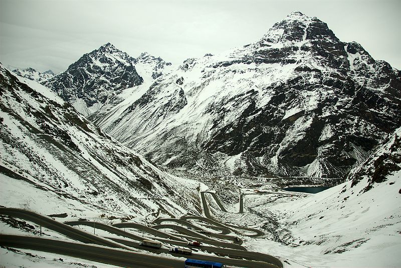 las curvas que hay en la foto del paso los Libertadores quedan en el lado chileno, que tiene una frontera muy fuerte, en contraste con la suavidad de pendiente y extensión del lado argentino, yo he atravesado varias veces ese túnel y que bueno que habran otro túnel que no se cierre en invierno, ya que éste queda tapado en nieve e interrumpido tras cada nevazón.