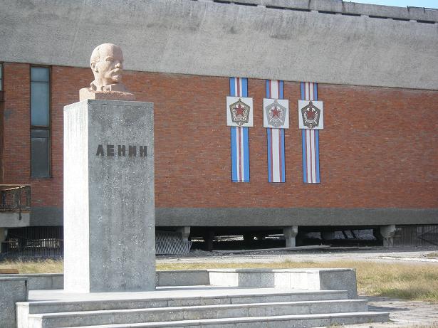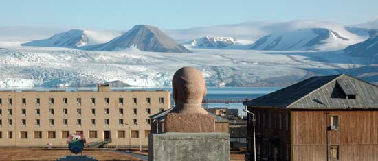 Sobre estas líneas, el puerto de Pyramiden, también abandonado (foto de Claudio Perazzari). Debajo, el busto de Lenin, poco satisfecho de lo que ve. O eso o algo estreñido (fuente)