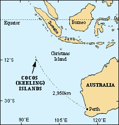 33.-  West Island, Islas Cocos, Australia. 2.110 kilómetros. Situadas a medio camino entre la costa australiana y Sri Lanka, forman otro Territorio Externo. Son un conjunto de atolones e islas sin autogobierno, de las que sólo dos están habitadas, (West Island y Home Island). La superficie del archipiélago es de 14 y su población apenas alcanza los 600 habitantes.