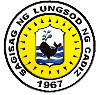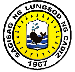 Escudo de la ciudad de Cádiz, Filipinas. Debajo, una vista de la playa (fuente).
