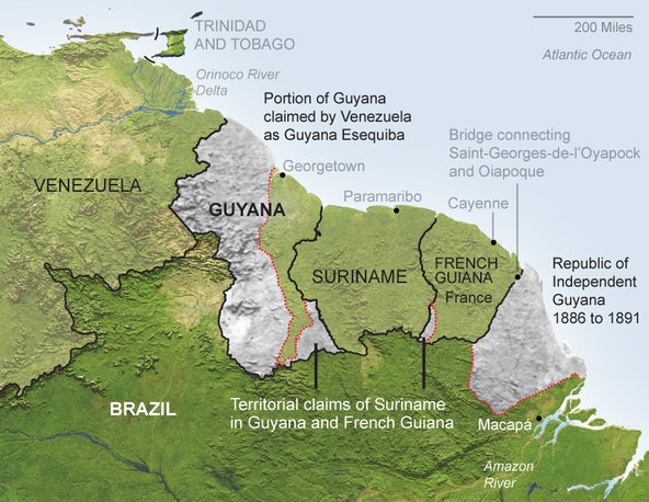 Mapa de la zona de las Guayanas donde se aprecia el tamaño de las reclamaciones comparado con el del país (fuente).
