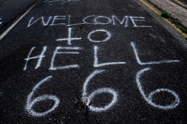 Ayer contamos aquí la historia de Centralia, el pueblo que fue abandonado hace casi tres décadas por culpa de un incendio todavía ardiente en una mina de carbón. El pueblo puede ser visitado, aunque las autoridades recomiendan encarecidamente no hacerlo bajo ningún concepto. El coche de Google Street View pasó por allí hace un tiempo, mostrando al mundo la desolación y el abandono en el que está sumido el otrora vibrante pueblecito de Pensilvania. Bill Bryson, en su clásico A walk in the woods, también cuenta su visita al pueblo en su habitual tono hilarante. Igualmente hilarantes son los grafittis que han ido dejando a lo largo de los años los residentes y los ocasionales visitantes del pueblo en el asfalto carente de mantenimiento de Centralia. «Bienvenido al infierno» es el saludo que el viajero intrépido puede encontrar en la carretera que da acceso al lugar.