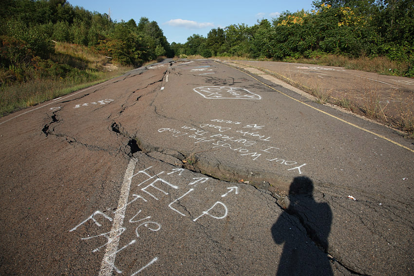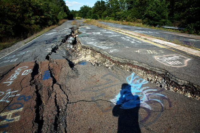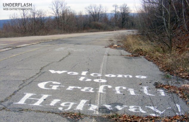 Ayer contamos aquí la historia de Centralia, el pueblo que fue abandonado hace casi tres décadas por culpa de un incendio todavía ardiente en una mina de carbón. El pueblo puede ser visitado, aunque las autoridades recomiendan encarecidamente no hacerlo bajo ningún concepto. El coche de Google Street View pasó por allí hace un tiempo, mostrando al mundo la desolación y el abandono en el que está sumido el otrora vibrante pueblecito de Pensilvania. Bill Bryson, en su clásico A walk in the woods, también cuenta su visita al pueblo en su habitual tono hilarante. Igualmente hilarantes son los grafittis que han ido dejando a lo largo de los años los residentes y los ocasionales visitantes del pueblo en el asfalto carente de mantenimiento de Centralia. «Bienvenido al infierno» es el saludo que el viajero intrépido puede encontrar en la carretera que da acceso al lugar.