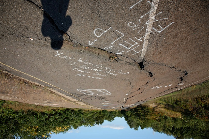 Arriba, una mención a Silent Hill entre otras muchas pintadas en el asfalto (clic en las fotos para ampliar). Debajo, «Socorro, me he caído». Dándole la vuelta a la imagen se puede leer también «Tus palabras están muertas. Yo las enterré. Están muertas». Buen rollito a tope (fuente)
