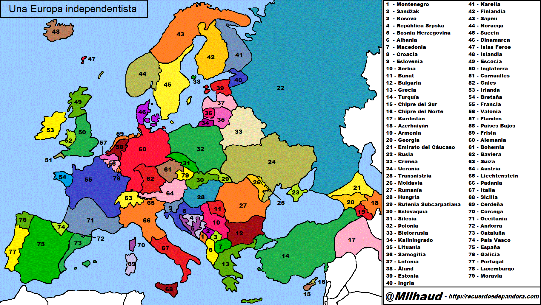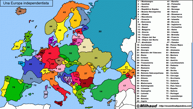Comenzamos por Milhaud, a quien ya parasitamos la semana pasada. En Recuerdos de Pandora podemos encontrar este mapa de una Europa donde han triunfado todos los independentismos. Bueno, todos no porque los independentismos se superponen a veces, es lo que tiene que el espacio sea limitado y el irredentismo no. Con la configuración de nuestro amigo Milhaud nos salen nada menos que 79 países, treinta y tantos más de los que hay actualmente (la cifra de cuántos países tiene Europa varía según entendamos lo que es Europa: ¿Chipre es Europa? ¿Georgia? ¿Osetia del Sur?). Desde Escocia al Emirato del Cáucaso y de los Països Catalans a Laponia, el triunfo de los independentismos haría las ceremonias de inauguración de los Juegos Olímpicos aún más largas y tediosas y las clases de Geografía del instituto una auténtica pesadilla. A ver, Jaimito, capitales de Rutenia Subcarpatiana, Transnistria y Moravia. El horror.