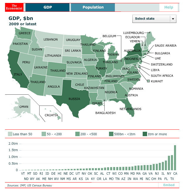 Bonita infografía del Economist comparando el PIB de cada estado de la Unión con otros países independientes. Debajo, más artesanal, lo mismo pero con las Comunidades Autónomas de España (fuente).