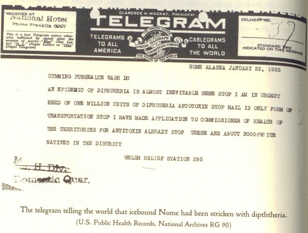 Y en esas estaban cuando en enero de 1925 Curtis Welch, a la sazón el único médico de Nome, diagnosticó un caso de difteria. La difteria es extremadamente contagiosa, y en aquella época la mortalidad era del 50% o más entre la población joven y anciana, y prácticamente del 100% entre los menores de 5 años. Durante el mes de diciembre dos niños nativos habían fallecido supuestamente de amidgalitis, mal diagnosticada y confundida con la difteria. Cuatro más fallecieron sin llegar a visitar al médico, con síntomas similares. El día 20 de enero el doctor diagnosticó el primer caso confirmado. El panorama, con cientos de niños y una bacteria que puede resistir semanas fuera del cuerpo humano, no podía ser más desalentador. Para colmo, las antitoxinas contra la difteria habían caducado, y aunque el médico había pedido más a Juneau (la capital de Alaska) las antitoxinas no llegaron a tiempo antes del cierre del puerto.