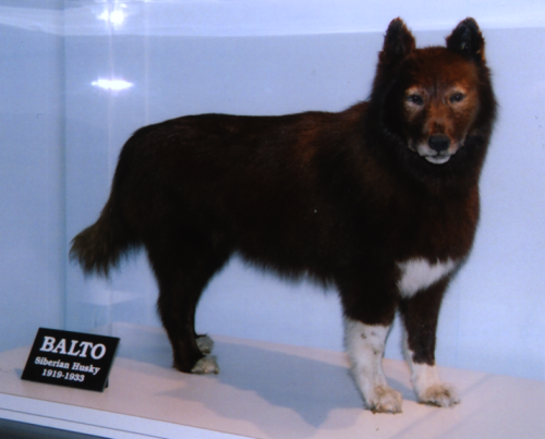 Estatuas de balto y Togo en el Zoo de Cleveland. Hay media docena de monumentos a estos perros o a sus mushers tanto en Alaska como en el resto de EE.UU., y un memorial dedicado a Seppala en Noruega. Los cuerpos de los dos perros se pueden ver el el Museo de Historia Natural de Cleveland (fuente)