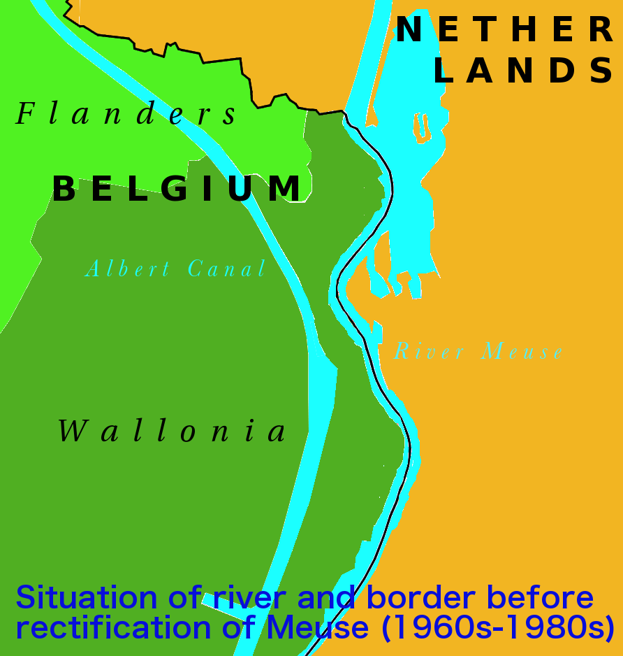 Parte de la frontera entre Bélgica y Holanda discurre por el río Mosa. El río es navegable hasta más allá de Lieja, uno de esos puertos tierra adentro que en el resto de Europa son tan comunes. Justo al sur de Maastricht (Mastrique para los puristas) existían unos meandros bastante molestos para la navegación, que fueron objeto de una serie de trabajos de acondicionamiento entre las décadas de los sesenta y los ochenta. El problema es que ese río hace de frontera en la zona y que modificar el río, sin embargo, no supone modificar la frontera internacional. Así que la frontera sigue el antiguo curso del río, pero no el nuevo. Y eso puede provocar disfuncionalidades territoriales, como de hecho fue el caso.