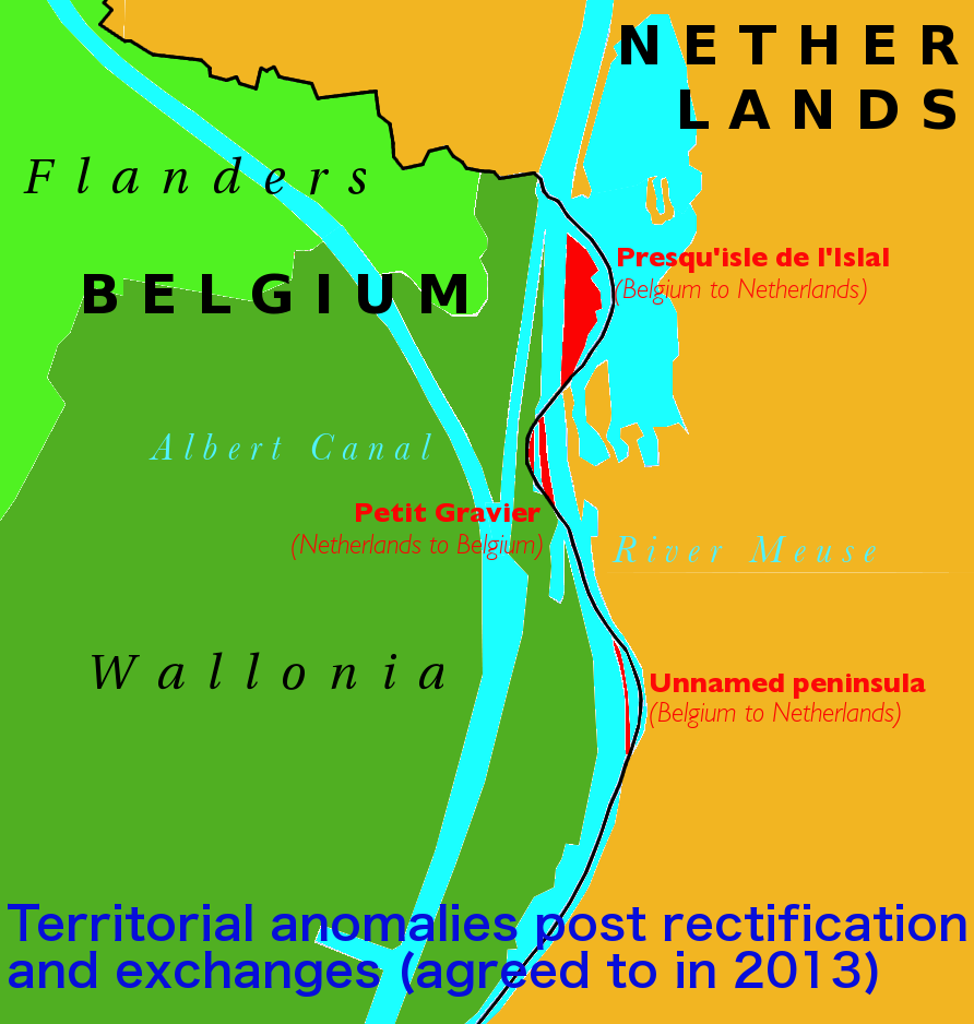 La modificación del cauce del río había dejado unos pocos pedazos de territorio en la orilla equivocada del río. Concretamente tres, uno llamado Presqu’ile de l’Islal, una pequeña península que pertenece a Bélgica, una zona de gravilla perteneciente a Holanda y una península sin nombre belga que también es contigua con el territorio holandés. En total apenas suman unas 20 hectáreas de territorio pero que aparentemente han llegado a provocar un cierto dolor de cabeza a las autoridades de los dos países, al convertirse en zonas fuera de la ley. La península de l’Islal, según algunas informaciones no del todo contrastadas, se convirtió en un refugio durante los noventa para la comunidad gay belga y holandesa. Lo cierto es que únicamente se recibió una queja por parte de algún bañista que afirmó ser importunado por otro hombre, pero aún así se pueden leer artículos hablando de la playa gay de Ejsden (el pueblo holandés que limita con ese pequeño territorio belga). Otras informaciones hablan de trapicheos de droga y de fiestas a horas intempestivas. Al ser territorio belga es inaccesible para la policía holandesa, y al estar al otro lado del río la policía belga no tiene posibilidad de llegar fácilmente hasta allí. Lo habitual.