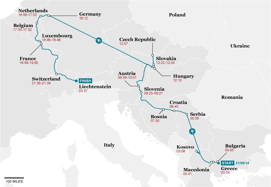 En total habían recorrido 2.240 kilómetros en coche, 302 entre Grecia y Skopje, unos 1.090 entre Belgrado y Viena y 848 entre Düsseldorf y Liechtenstein, lo que les ocupó unas 19 horas y media de las 24 de las que disponían. El resto se fue entre vuelos, esperas en el aeropuerto y las oficinas de alquiler de coches. Este récord, que hasta el 21 de septiembre poseían cuatro amigos que lo establecieron en 2012, se une a los otros dos que ya posee Gunnar Garfors: ser el viajero más joven en visitar los 198 países del mundo y haber visitado cinco continentes en el mismo día. Hay gente que no sabe lo que es tener el culo quieto.