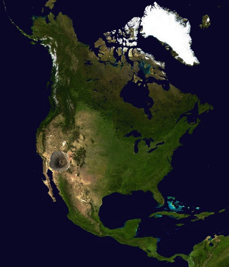 Aquí tenemos a América del Norte en Marte. Como se puede comprobar, ocuparía una gran parte del planeta; lógico, teniendo en cuenta que la superficie marciana es casi equivalente a la del total de tierras emergidas en la Tierra. Pero claro, compararse con Marte, que es rojito, pequeñajo y polvoriento es fácil. ¿Qué tal si trasladamos América del Norte a Júpiter?