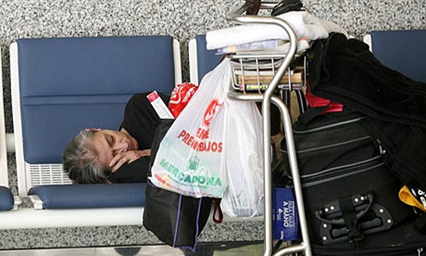 Hasta ahora se han reseñado las historias de gente que se quedó atrapada en aeropuertos por problemas burocráticos, diplomáticos o, en algunos casos, mentales. Pero la inmensa mayoría de la gente que duerme en aeropuertos lo hace por motivos puramente económicos. Un gran aeropuerto, en definitiva, es un lugar caliente, a cubierto, y vigilado y que no cierra por las noches. Si uno no llama la atención nadie le hará caso, y podrá pasar por alguno de las decenas de miles de viajeros que cada día cruzan sus destinos allí. Se calcula que en Barajas viven treinta personas de manera regular, y más de cien en Londres Heathrow. Pero son invisibles: no mendigan, no roban y van vestidos de forma absolutamente correcta. Hasta tienen maletas para disimular. Uno puede tomar decenas de vuelos a lo largo del tiempo sin ni siquiera llegar a percatarse de su existencia.