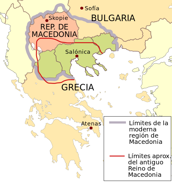 Por el lado griego Macedonia fue desde 1913 una de las seis regiones administrativas continentales de Grecia, hasta 1987, fecha en la que aparecieron las tres regiones (llamadas periferias) que ahora llevan el nombre del viejo reino: Macedonia Oriental, Central y Occidental. Sólo las dos últimas comparten frontera con el estado independiente. Para Grecia el término Macedonia se refiere exclusivamente a la región griega, y se ha opuesto durante más de un siglo al uso del término por parte de sus vecinos del norte, antes, durante y después de la existencia de una unidad administrativa denominada así. Cuando en 1991 la República de Macedonia se independizó de Yugoslavia el gobierno griego inició una fortísima campaña de lobby internacional para obligar al país recién nacido a cambiar su nombre. La ONU y otras organizaciones únicamente reconocen al país como «Former Yugoslav Republic of Macedonia«, o FYROM. Grecia ha vetado el ingreso de Macedonia en la OTAN y prevé hacer lo propio con cualquier intento macedonio de ingresar en la Unión Europea. La oposición griega es heredera de la historia turbulenta de los Balcanes: el nombre hace la cosa y el irredentismo, el revanchismo y el nacionalismo han hecho estragos en los últimos doscientos años. Que haya una Macedonia que se proclame heredera de Alejandro Magno justo al norte de otra Macedonia puede provocar ideas expansionistas a políticos sin demasiados escrúpulos. Quizás sea exagerado, pero los Balcanes están llenos de sangrientas historias igual de improbables.