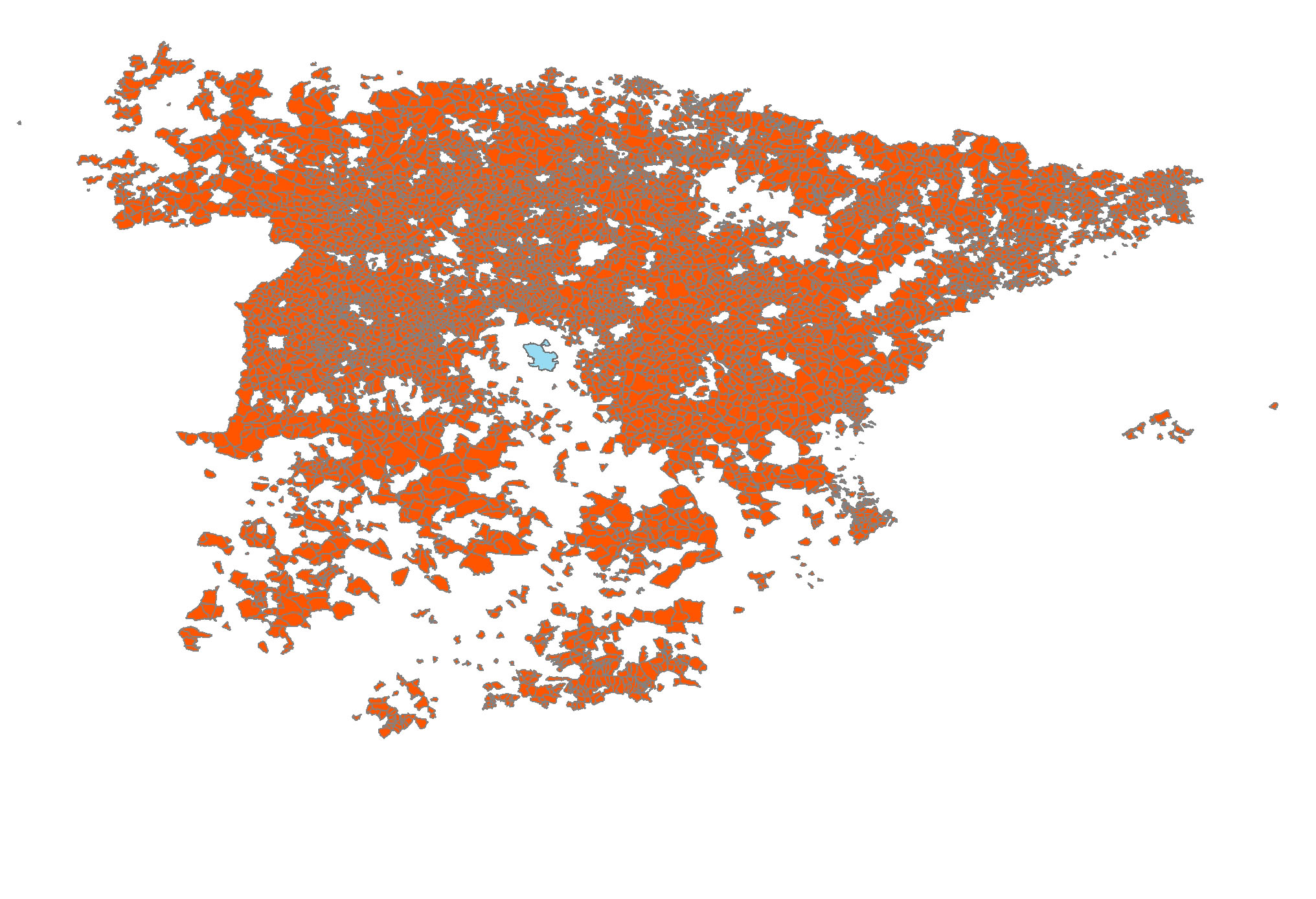 La zona roja representa la mitad de la población de España, igual que la zona azul. La mitad de la población española vive en 125 de los más de ocho mil municipios constituidos. Dato a tener en cuenta: Casi cinco mil ayuntamientos (60% del total) cuentan con menos de mil habitantes, y nada menos que mil (13% del total) gobiernan a menos de cien personas.