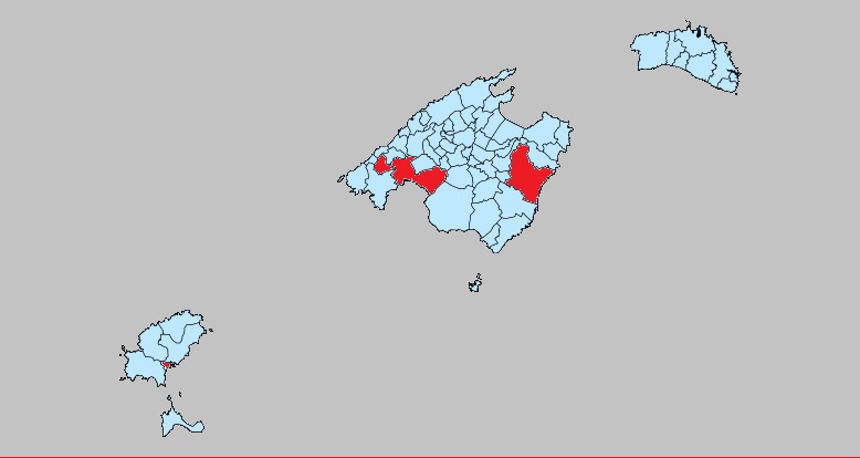 El mismo número de municipios, cuatro, suman la mitad de todos los habitantes de las Islas Baleares: Palma, Calviá y Manacor en la isla de Mallorca e Ibiza en la isla homónima (en el mapa casi ni se aprecia, por lo pequeña que es la localidad).