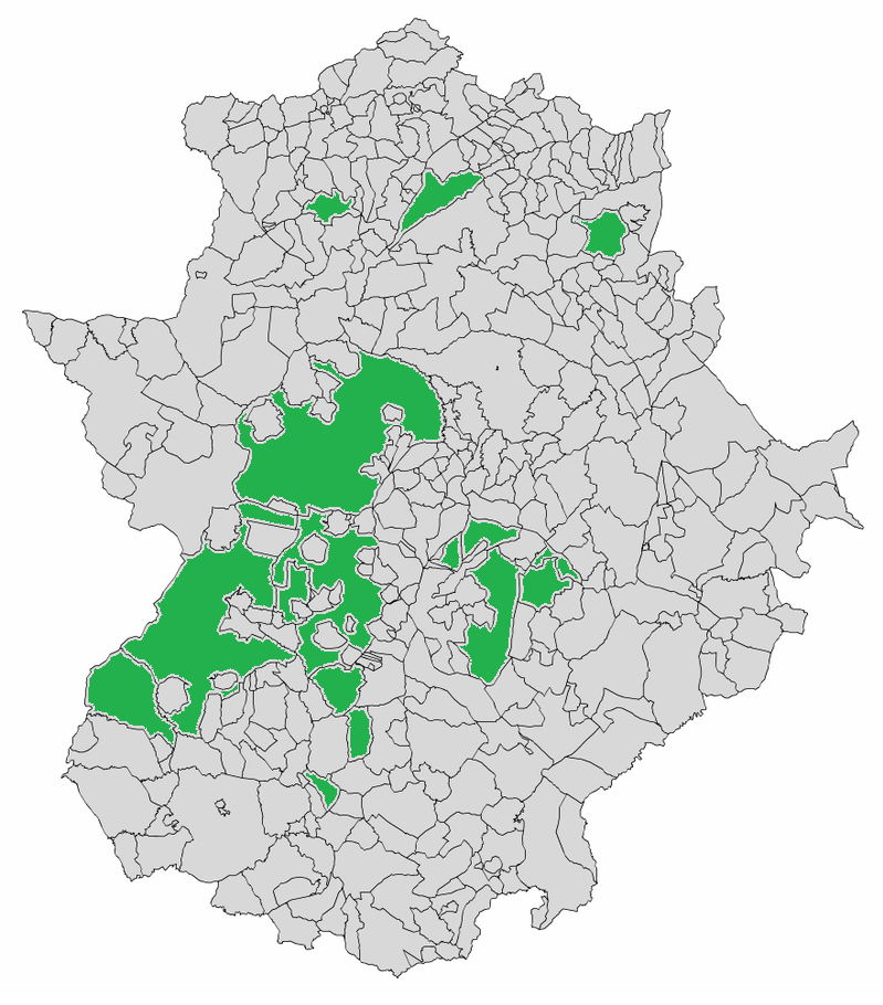 Catorce son los municipios extremeños de más de diez mil habitantes; entre todos suman la mitad de la población de la comunidad autónoma; 14 de un total de 322, que viene a ser poco más del 4% del total. Entre ellos están Cáceres y Badajoz, que ocupan los puestos 1 y 3 en la clasificación de las localidades españolas por superficie. Las ciudades están a casi 100 kilómetros por carretera, pero sus términos municipales son limítrofes.