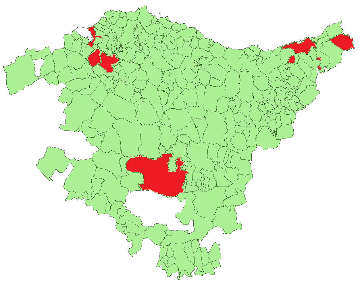 El caso vasco es similar al navarro. También son siete municipios (las tres capitales más Baracaldo, Irún, Guecho y Portugalete) los que concentran la mitad de los poco más de dos millones de habitantes de la Comunidad Autónoma. En el mapa aparecen sombreados más territorios, pero son los enclaves de San Sebastián.