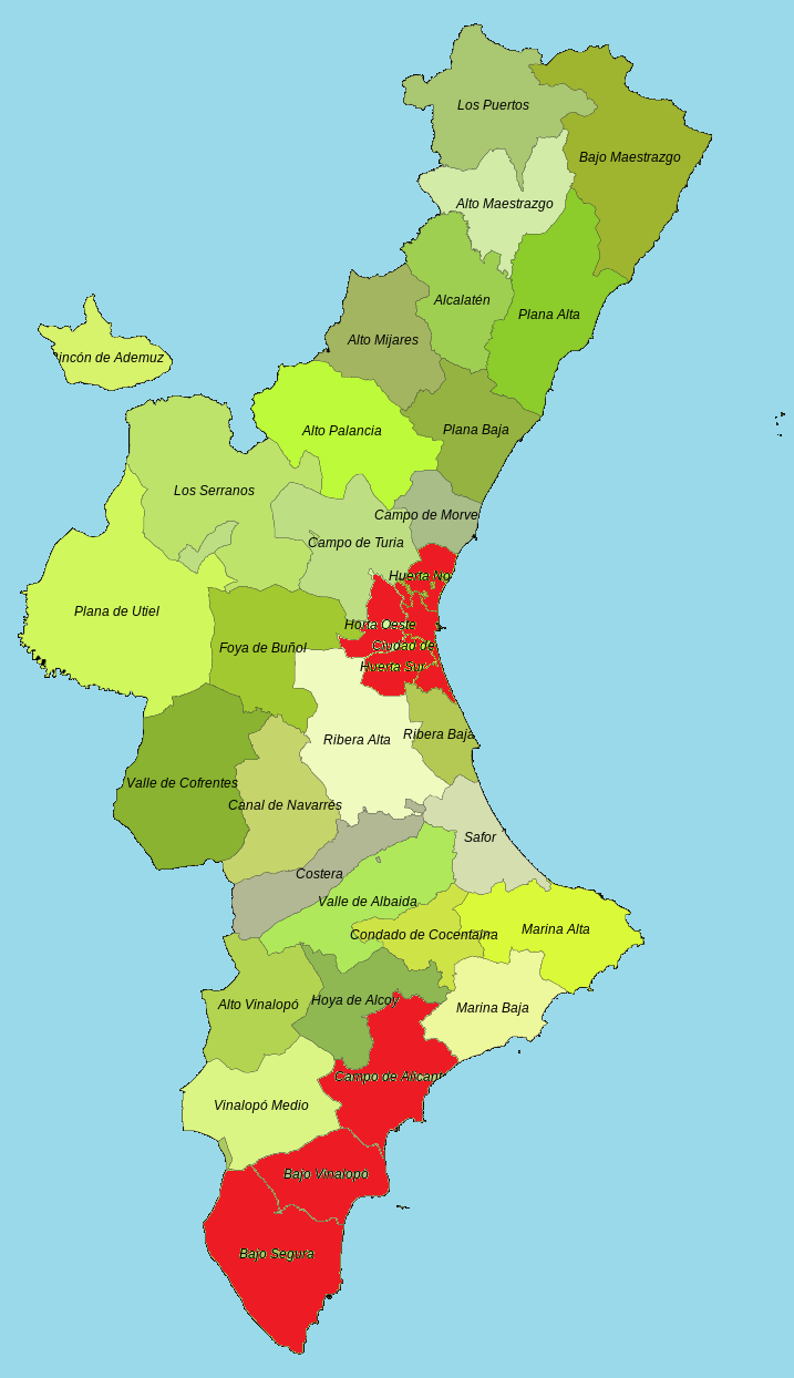 En la Comunidad Valenciana los 21 municipios más poblados tienen la misma población que los 521 restantes. Si lo miramos a nivel comarcal, las siete más pobladas concentran la misma población que las otras 27.