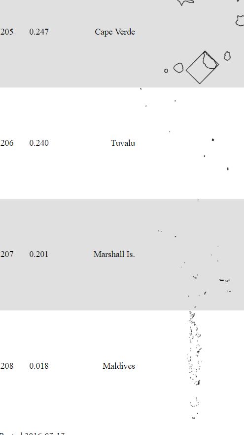 La cola de la clasificación, como es esperable, está ocupada por archipiélagos dispersos como Indonesia, Kiribati o las Seychelles, cuya exigua superficie total se distribuye por un área descomunal. Cierran la clasificación Tuvalu, las Islas Marshall y Maldivas.