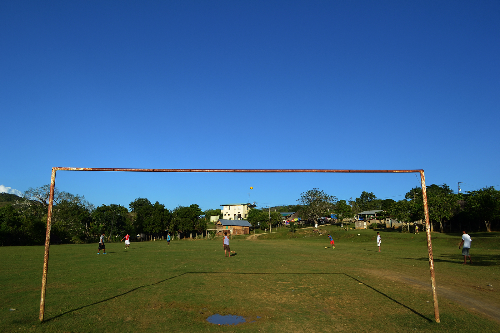 Podría creerse que el caso de Kostajnica es único, pero no, no lo es. Cambiemos de continente. Nos vamos a El Arenal, Guatemala. En el pueblo hay medio campo de fútbol, y digo medio porque la otra mitad se encuentra en El Arenal, Belice. La línea imaginaria aquí es exactamente eso, imaginaria, y cruza por la medio campo la cancha. Los niños de uno y otro lado juegan al fútbol todos las semanas, pero defendiendo siempre la portería de su país. Cada domingo se juega un partido internacional, en el sentido más literal de la palabra.