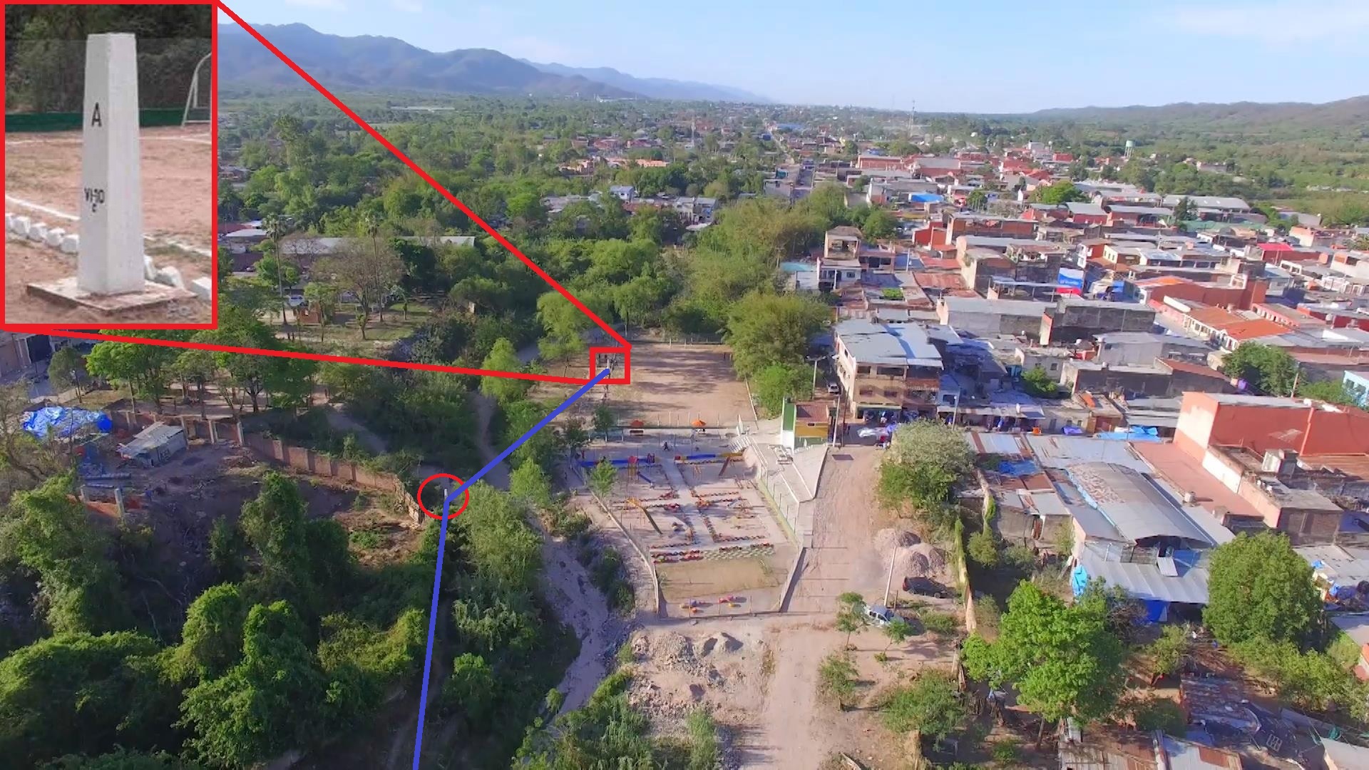 Los vecinos de San José de Pocitos llevaban mucho tiempo pidiéndole a la alcaldía que instalara un parque para que los niños pudieran jugar en algún lugar del pueblo. El problema es que, si miramos el mapa más arriba, San José de Pocitos está encajonado entre dos ramales de la frontera argentina y el suelo no abunda. Así que finalmente cedieron e instalaron el parque en uno de los pocos lugares libres, situado justo junto a la frontera. El parque fue inaugurado en octubre de 2017 y cuenta con toboganes, columpios y, atención, un campo de fútbol con porterías metálicas. Para darle algo más de empaque se decidió instalar una pequeña tribuna en el lateral occidental del campo, sin tener demasiado en cuenta que ese trozo de terreno ya pertenecía a Argentina.