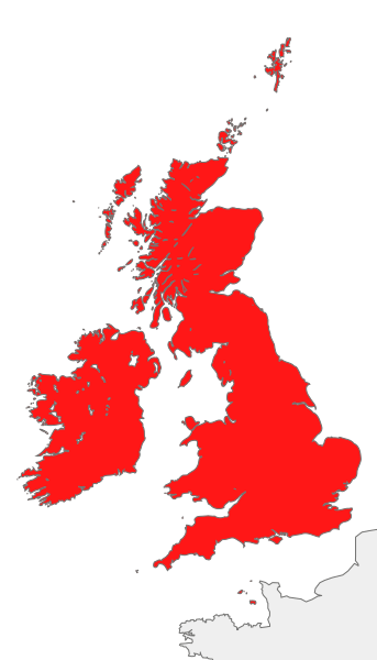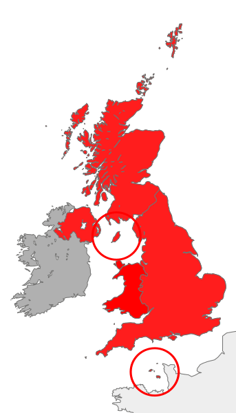 El Reino Unido más las Dependencias de la Corona, la Isla de Man, Guernsey y Jersey (en los circulitos). En la ley británica se denominan British Islands