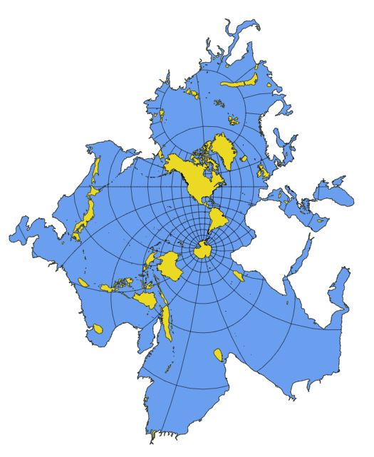 Mapa de Spilhaus (via Frank Jacobs), en el que los océanos son tratados como una única masa de agua (técnicamente lo son, de hecho) y los continentes quedan a su alrededor completamente irreconocibles. Es horrible y dan ganas de invadir Polonia, pero es ciertamente ingeniosa. En su versión con relieve es aún más inquietante.Otra versión del mapa de Spilhaus, basada en una proyección estereográfica centrada a 45º S, 95º O (en las antípodas de Urumqi, más o menos, que es el lugar más lejano a cualquier costa del mundo)Athelstan Spilhaus publicó muchos mapas en un libro de 1991 titulado Atlas of the World with Geophysical Boundaries, que está disponible en Google Books para vuestro gozo y disfrute. Este en concreto muestra el Océano Pacífico en el medio y el resto de continentes y océanos a ambos lados.