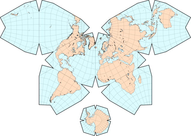 Una proyección cartográfica es, según la Wikipedia, «un sistema de representación gráfica que establece una relación ordenada entre los puntos de la superficie curva de la Tierra y los de una superficie plana». Es decir, una manera de trasladar la realidad esférica de nuestro planeta a una superficie plana. Hay que partir de un hecho: no es matemáticamente posible hacerlo de forma precisa: cualquier proyección cartográfica conservará, como máximo, una de las tres características principales de un mapa: los ángulos, las áreas y las distancias. O sea: hay que elegir entre las siluetas de los continentes y países, las superficies de esos mismos continentes y países o la distancia entre dos puntos del mapa, pero más de una es imposible. Todos los mapamundis que conoces, por lo tanto, están mal. Una vez establecida esa regla fundamental, un mapamundi puede venir en cualquier forma y sabor, y eso es lo que vamos a ver hoy: proyecciones cartográficas más bien raras.